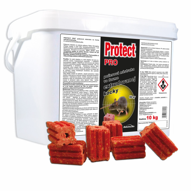 PROTECT PRO požerová nástraha vo forme extrudovanej kocky na ničenie potkanov (Rattus norvegicus) a myší (Mus musculus) pre použitie v interiéri a bezprostrednom okolí budov/objektov.